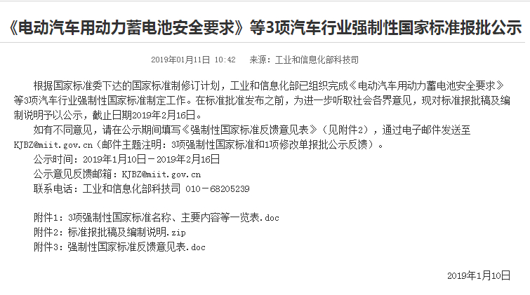 根据国家标准委下达的国家标准制修订计划,工息部已组织完成《电动汽车用动力蓄电池安全要求》等3项汽车行业强制性国家标准制定工作。在标准批准发布之前,为进一步听取社会各界意见,现对标准报批稿及编制说明予以公示,截止日期2019年2月16日。 [详细]