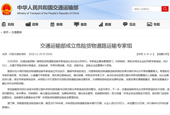 交通运输部:成立危险货物道路运输专家组 促进危险品