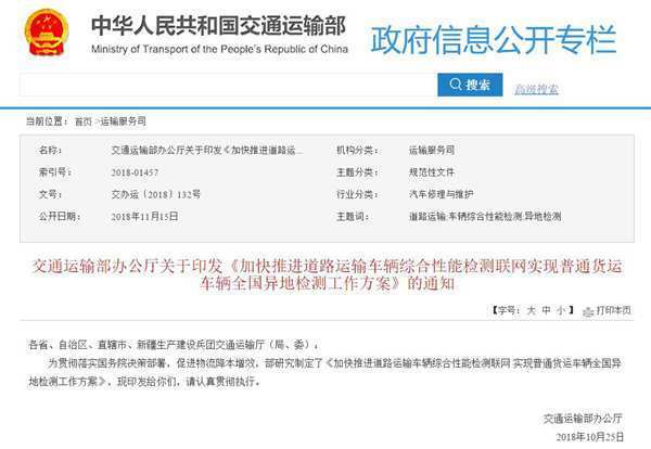 近日,交通运输部发布了《加快推进道路运输车辆综合性能检测联网 实现普通货运车辆全国异地检测工作方案》,重点要求各省建立综检联网系统,并在2019年底前实现普通货运车辆全国异地审验。 [详细]