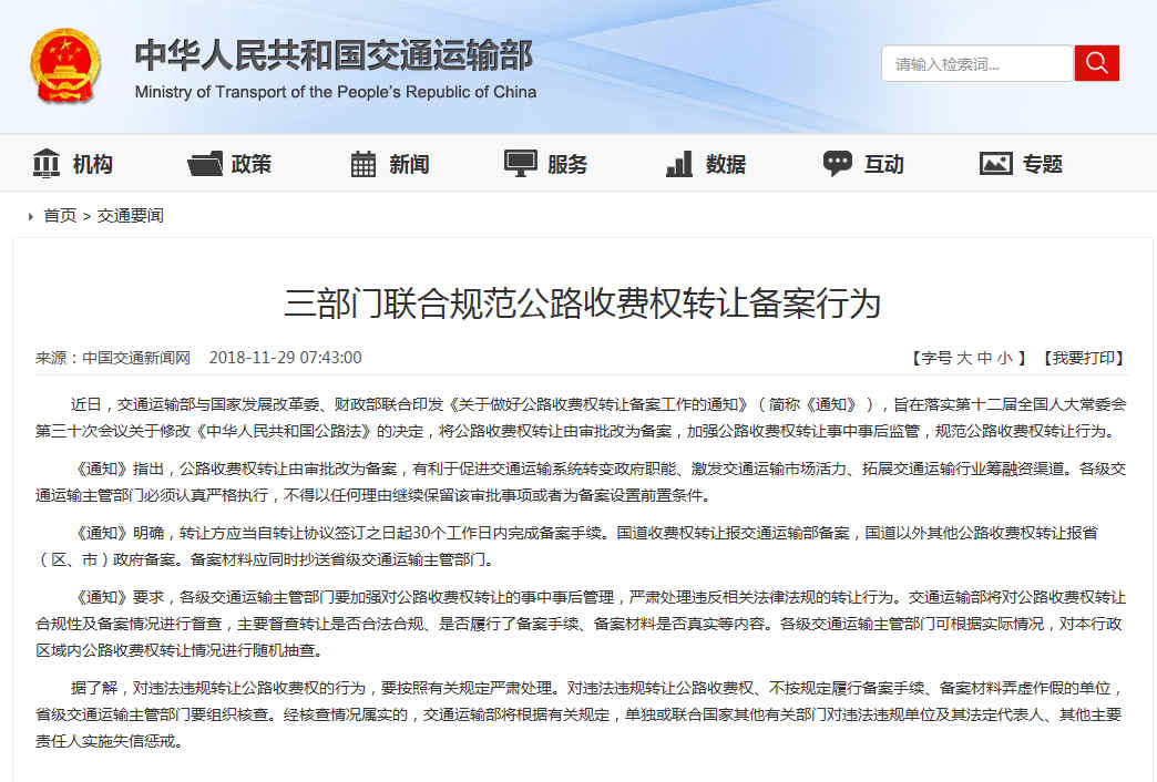 交通运输部与国家发展改革委、财政部联合印发《关于做好公路收费权转让备案工作的通知》,旨在落实第十二届全国人大常委会第三十次会议关于修改《中华人民共和国公路法》的决定,将公路收费权转让由审批改为备案,加强公路收费权转让事中事后监管,规范公路收费权转让行为。 [详细]