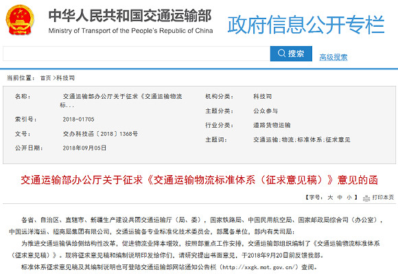 交通运输部发布《交通运输物流标准体系(征求意见稿)