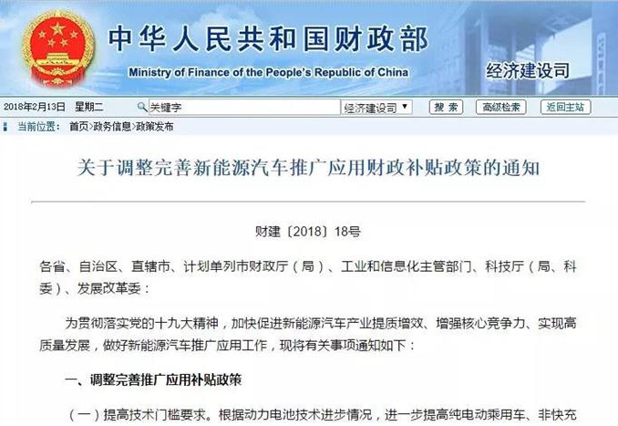 2018年2月13日,财政部等四部门联合发布调整完善新能源汽车推广应用财政补贴政策的通知,规定从2018年2月12日至2018年6月11日为新政过渡期,过渡期间上牌的新能源乘用车、新能源客车按照对应标准的0.7倍补贴,新能源货车和专用车按0.4倍补贴,燃料电池汽车补贴标准不变。与20 [详细]