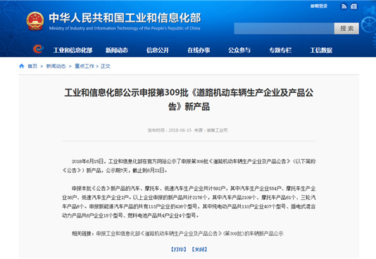 工信部发布第309批新车公示