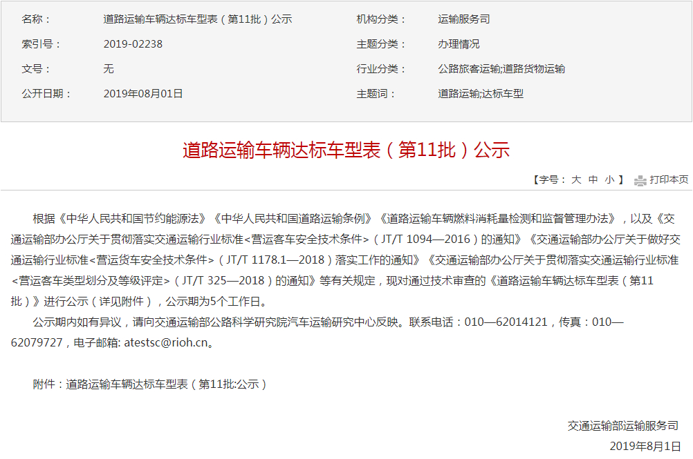 交通运输部进行道路运输车辆达标车型表(第11批)公示