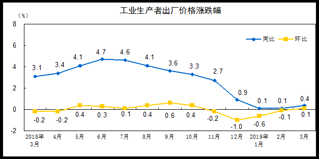 中国3月PPI同比增长0.4% 同比涨幅略有扩大