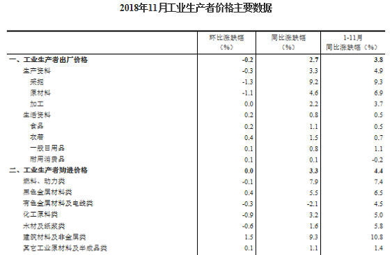 2018年11月份工业生产者出厂价格同比上涨2.7%