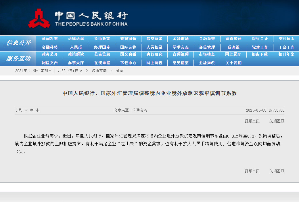 2021年1月5日,中国人民银行、国家外汇管理局宣布决定将境内企业境外放款的宏观审慎调节系数由0.3上调至0.5。 [详细]