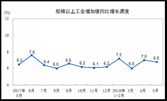 2018年5月份,规模以上工业增加值同比实际增长6.8%(以下增加值增速均为扣除价格因素的实际增长率),比上年同月加快0.3个百分点,比4月份回落0.2个百分点。从环比看,5月份,规模以上工业增加值比上月增长0.58%。1-5月份,规模以上工业增加值同比增长6.9%,与1-4月份持平。 [详细]