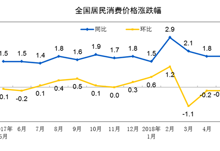 2018年5月份,全国居民消费价格同比上涨1.8%。其中,城市上涨1.8%,农村上涨1.7%;食品价格上涨0.1%,非食品价格上涨2.2%;消费品价格上涨1.3%,服务价格上涨2.5%。1-5月平均,全国居民消费价格比2017年同期上涨2.0%。 [详细]