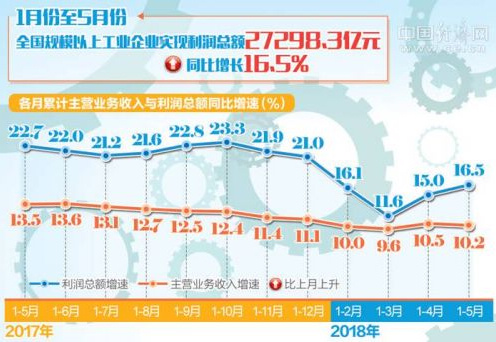 2018年1-5月份,全国规模以上工业企业利润同比增长16.5%,增速比1-4月份加快1.5个百分点;其中,5月份增长21.1%,比4月份增速减缓0.8个百分点,延续了快速增长的势头。其中供给侧结构性改革成效持续显现:一是成本下降;二是杠杆率降低。同时工业企业效益总体持续改善:一是 [详细]