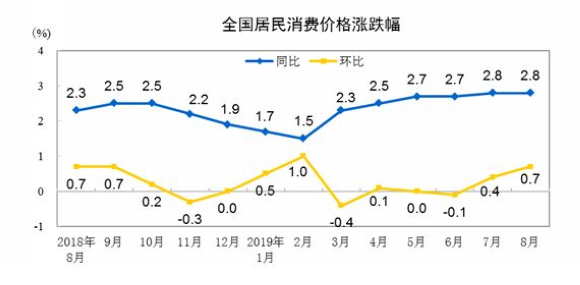 统计局:8月CPI同比上涨2.8% PPI同比下降0.8%