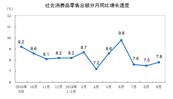 2019年前三季度社会消费品零售总额增长8.2%