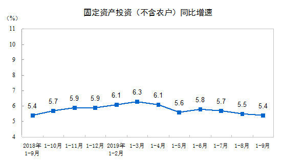 2019年1—9月份全国固定资产投资(不含农户)增长5.4%