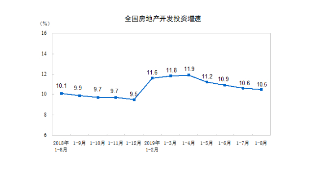 2019年1—8月份,全国房地产开发投资84589亿元,同比增长10.5%,增速比1—7月份回落0.1个百分点。其中,住宅投资62187亿元,增长14.9%,增速回落0.2个百分点。 [详细]