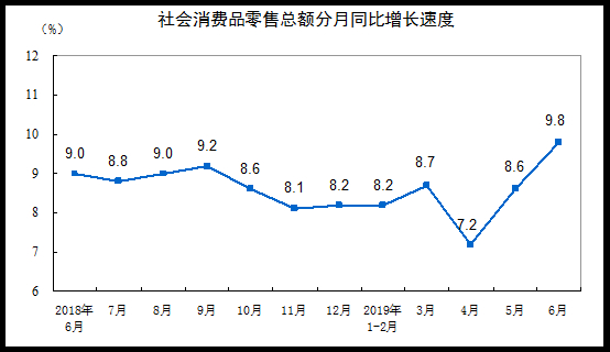 2019年上半年,社会消费品零售总额195210亿元,同比名义增长8.4%(扣除价格因素实际增长6.7%,以下除特殊说明外均为名义增长)。其中,6月份社会消费品零售总额33878亿元,同比增长9.8%。 [详细]