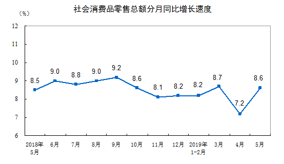 2019年5月份,社会消费品零售总额32956亿元,同比名义增长8.6%(扣除价格因素实际增长6.4%,以下除特殊说明外均为名义增长)。其中,限额以上单位消费品零售额11694亿元,增长5.1%。2019年1-5月份,社会消费品零售总额161332亿元,同比增长8.1%。其中,限额以上单位消费品零售 [详细]