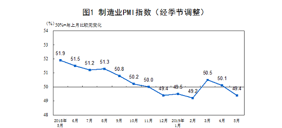 2019年5月份,中国制造业采购经理指数(PMI)为49.4%,比上月回落0.7个百分点。从企业规模看,大型企业PMI为50.3%,比上月回落0.5个百分点,仍高于临界点;中、小型企业PMI为48.8%和47.8%,分别比上月下降0.3和2.0个百分点。从分类指数看,在构成制造业PMI的5个分类指数中,生产 [详细]