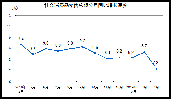 2019年4月份,社会消费品零售总额30586亿元,同比名义增长7.2%(扣除价格因素实际增长5.1%,以下除特殊说明外均为名义增长)。其中,限额以上单位消费品零售额11120亿元,增长2.0%。 [详细]