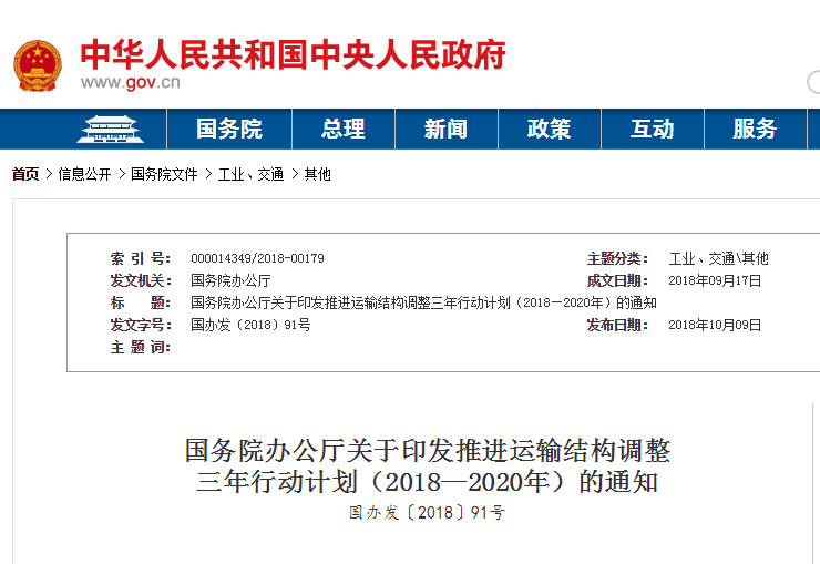 近日,国务院办公厅印发了《推进运输结构调整三年行动计划(2018-2020年)》。《行动计划》要求,以深化交通运输供给侧结构性改革为主线,以京津冀及周边地区、长三角地区、汾渭平原等区域为主战场,以推进大宗货物运输“公转铁、公转水”为主攻方向,通过三年集中攻坚,实现全 [详细]