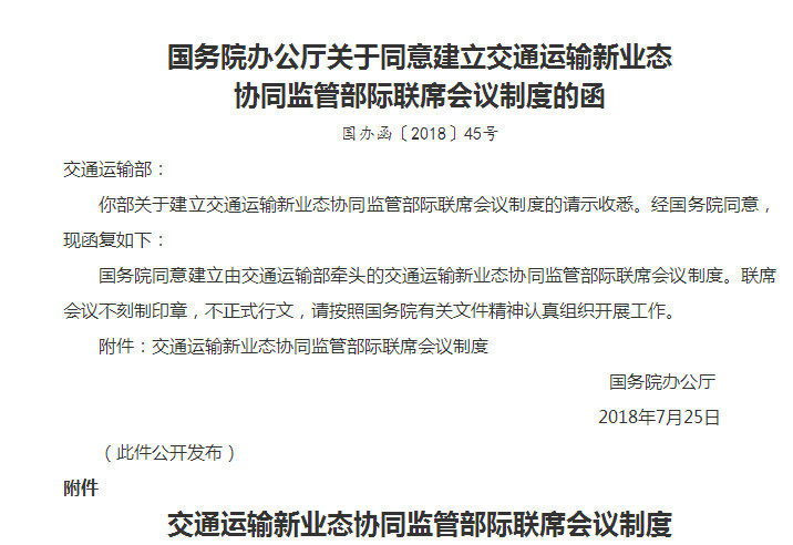 国务院办公厅关于同意建立交通运输新业态协同监管部际