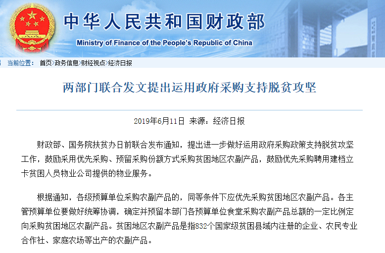 两部门联合发文提出运用政府采购支持脱贫攻坚