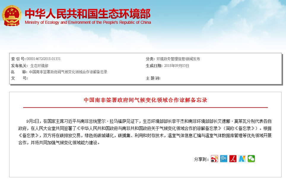 9月2日,在国家主席习近平与南非总统里尔·拉马福萨见证下,生态环境部部长李干杰和南非环境部部长艾德娜·莫莱瓦分别代表各自政府,在人民大会堂共同签署了《中华人民共和国政府与南非共和国政府关于气候变化领域合作的谅解备忘录》(简称《备忘录》)。 [详细]