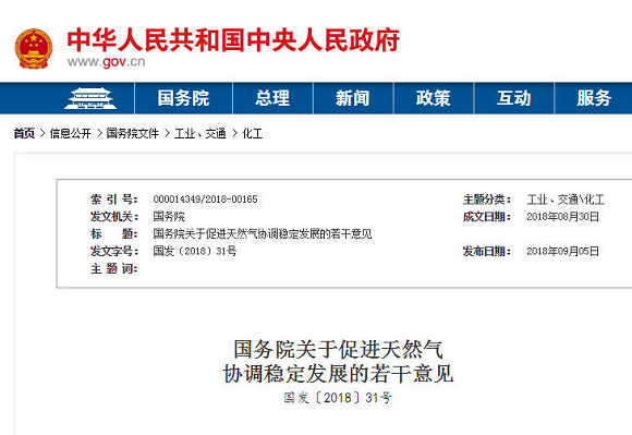 国务院印发《关于促进天然气协调稳定发展的若干意见》