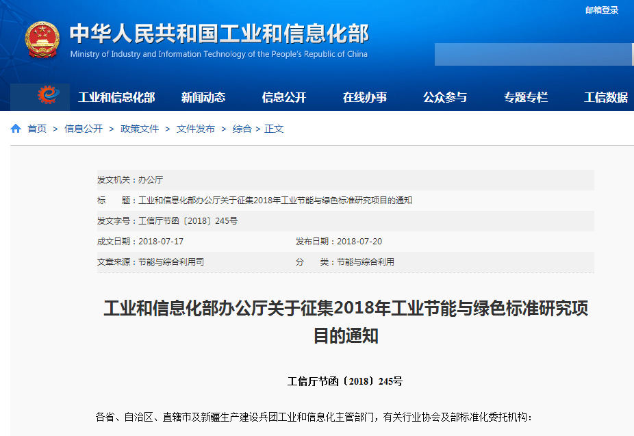 工信部征集2018年工业节能与绿色标准研究项目的通知