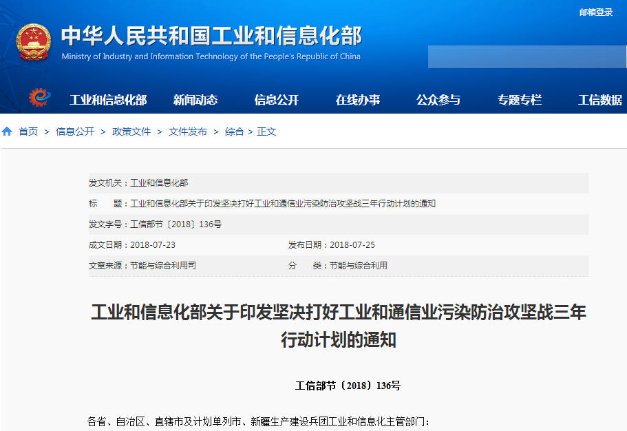 工信部印发坚决打好污染防治攻坚战三年行动计划