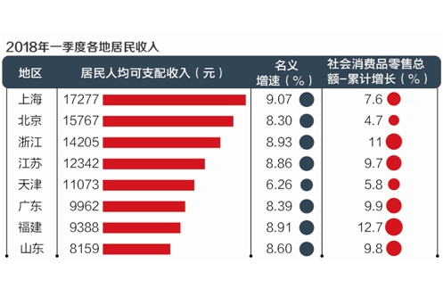 近日,国家统计局和地方统计局陆续公布了2018一季度31省市的居民人均可支配收入。数据显示,一季度上海居民人均可支配收入达到17277元,位居全国31省份第一位,第二名为北京,达到了15767元。天津、江苏、浙江居民人均可支配收入也在万元以上。 [详细]