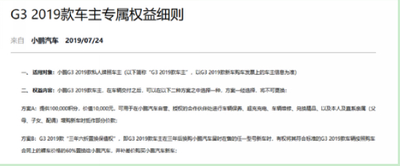 7月24日小鹏汽车通过官网发布了G3 2019款车主专属权益细则。根据细则,对已经完成交付的G3 2019款车主可以选择A、B两种补偿方案。 [详细]