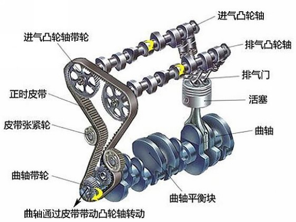 按照发动机每一气缸内所进行的工作循环和点火顺序的要求,定时开启和关闭各气缸的进、排气门,使新鲜的可燃混合气或空气得以及时进入气缸,废气得以及时从气缸排出。在压缩与作功行程中,关闭气门保证燃烧室的密封。