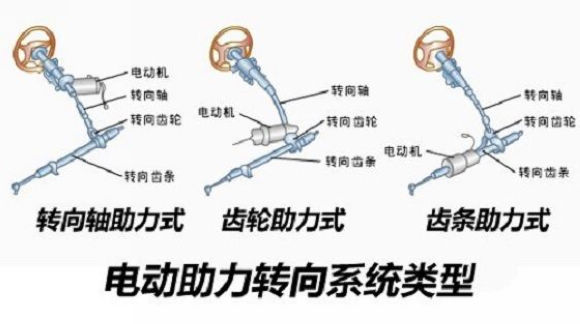 电动助力转向系统有三种方式,分别为转向轴助力式、齿轮助力式、齿条助力式。