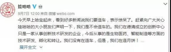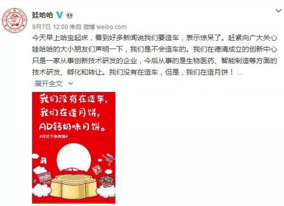 2018年9月7日12点整,娃哈哈官微发布消息称,“今天早上哈宝起床,看到好多新闻说我们要造车,表示惊呆了。赶紧向广大关心娃哈哈的大小朋友们声明一下,我们是不会造车的。我们在德清成立的创新中心只是一家从事创新技术研发的企业,今后从事的是生物医药、智能制造等方面的技术研发、孵化和转让。我们没有在造车,但是,我们在造月饼!”