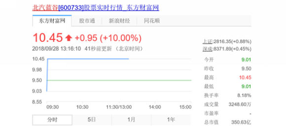 9月28日,北汽蓝谷(600733.sh)一早开盘后,迅速涨停。截至今日收盘,北汽蓝谷报价10.45元,市值回升至350.6亿元。