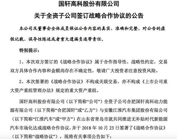 江淮汽车正全力加快新能源汽车布局,而国轩高科或将成为其有利后援。10月24日,国轩高科(002074)发表公告称,其全资子公司合肥国轩高科动力能源有限公司(简称“合肥国轩”)与安徽江淮汽车集团股份有限公司(简称“江淮汽车”)已正式签署了《战略合作协议》,拟达成超过40亿元的电池供应订单。