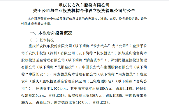 近日,长安汽车对外发布公告,旗下全资子公司长安汽车投资(深圳)有限公司拟与重庆渝富资本股权投资基金管理有限公司、深圳民银金控投资管理有限公司、南方德茂资本管理有限公司等企业共同成立安和(重庆)股权投资基金管理有限公司,注册资本为人民币1000万元。