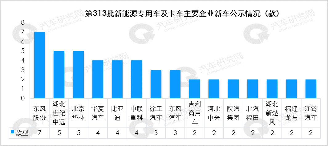 本批共有265家车企的727款专用车及卡车车型申报,从申报的新能源卡车型来看,本批共有32家车企的67款新能源专用车及卡车车型申报,此次申报的企业主要包括:东风股份、湖北中远世纪和北京华林三家企业申报均超过5款车型,其他企业申报车型多数在2—4款,目前,新能源卡车及专用车市场主要仍以纯电动物流车和环卫车为主。