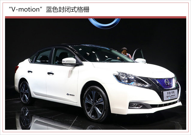 东风日产轩逸·纯电前脸采用家族V-Motion设计语言,封闭式格栅以及灯组内部加入蓝色元素点缀,且充电口隐藏其中;同时周围黑色“V”型面板搭配两侧熏黑式头灯组,使整车具有辨识度。这款车前保险杠设计较为简洁,底部两侧带有镀铬饰条点缀,黑色饰板内部嵌入有圆形雾灯。