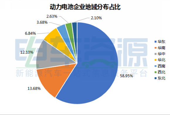 190余家电池企业按照地域分布划分,华东地区共计112家,占比58.95%;华南地区共计26家,占比13.68%;华中地区共计23家,占比12.10%;华北地区共计13家,占比6.84%;西南、西北地区两个地区分别为7家和5家企业;东北地区分布量最少,仅拥有4家企业。