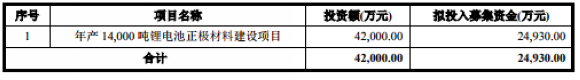 该项目总投资4.2亿元,其中固定资产投资3.6亿元,流动资金6000万元,已取得土地使用权证书,项目建设期共36个月,第36个月投产。采用新工艺和新技术合成高性能锂电池正极材料,将满足目前新能源领域高端动力电池市场及储能市场的需求。公司预计,项目建成后每年可实现销售收入10.17亿元、净利润1.32亿元。