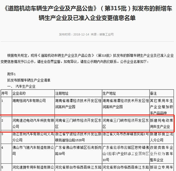 2018年10月14日,工信部发布《道路机动车辆生产企业及产品公告》(第315批)拟发布的新增车辆生产企业及已准入企业变更信息名单。从名单中,我们可以看到,河南速达电动汽车科技有限公司在列,这意味着,河南速达经过了工信部审核这一关,将正式拿到新能源乘用车生产牌照,成为第11家正式获得新能源乘用车生产资质的车企。