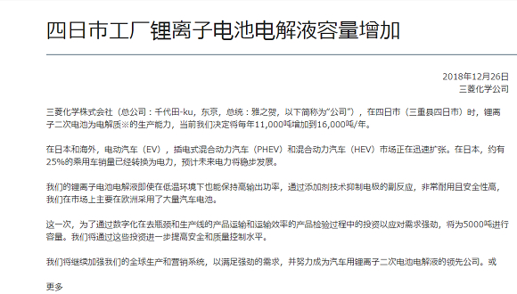 事实上,三菱化学在电解液领域的扩产计划一直在进行。在据日媒7月份消息,因2020年以后全球主要国家/区域将强化车辆CO2排放限制,加快电动车(EV)等电动化车款普及速度、推升电池材料需求旺盛,三菱化学计划于2020年度结束前投资100-150亿日元大幅扩增锂离子电池关键材料产能。