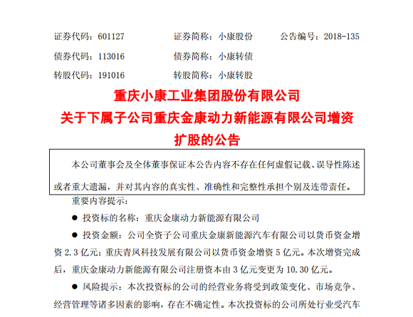重庆国资9.6亿增资金康新能源 小康股份持股比例降至80.645%