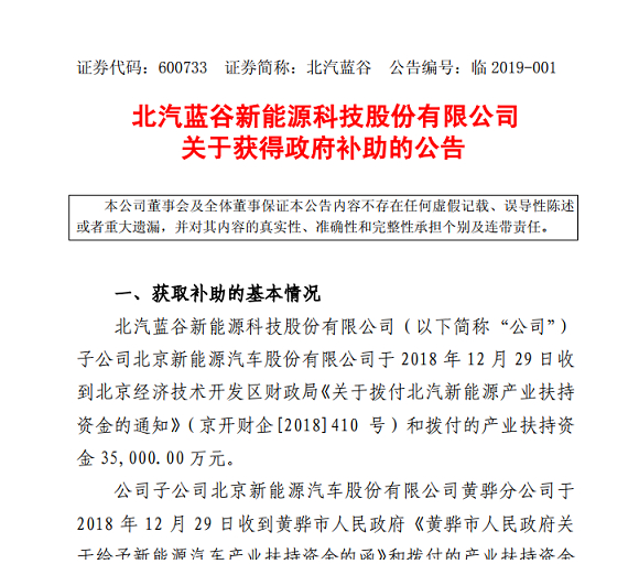 1月2日下午,北汽蓝谷发布公告称,公司子公司北京新能源汽车收到北京经济技术开发区财政局关于拨付北汽新能源产业扶持资金的通知和拨付的产业扶持资金3.5亿元。