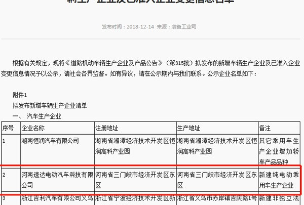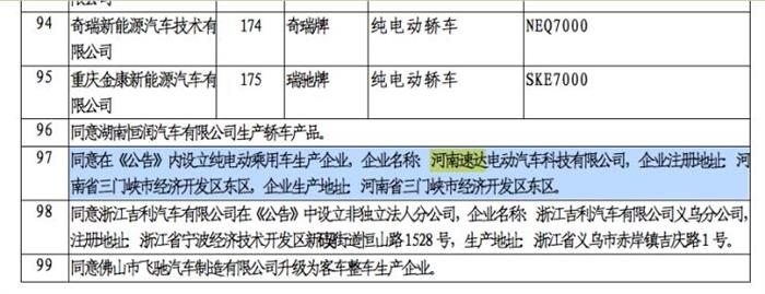 《公告》内容显示,同意在《公告》内设立纯电动乘用车生产企业,企业名称为“河南速达电动汽车科技有限公司”,企业注册地址为“河南省三门峡市经济开发区东区”,企业生产地址为“河南省三门峡市经济开发区东区”。