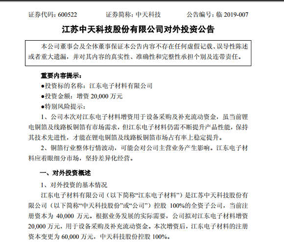 而中天科技对江东电子材料增资2亿元用于其设备采购和提供发展资金,也是为公司进一步加码锂电铜箔和结构件市场做准备。