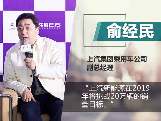 1月18日,在荣威Ei5北京区域上市暨首批用户交车仪式上。上汽乘用车公司副总经理俞经民表示:上汽新能源在2019年销量目标要实现翻番,挑战20万辆。产品方面,包括荣威一款全新新能源SUV、名爵EZS等4款全新产品在年内陆续上市后,上汽新能源产品矩阵将增至11款。