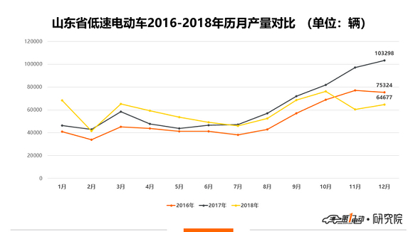 据山东省汽车行业协会统计,2018年12月,山东省生产四轮低速电动车总计64677辆,环比略微增长6.97%,同比继续下降37.39%。与2017年和2016年产量月度走势对比来看,2018年年末冲量走势并未出现,反而罕见下滑,甚至不及2016年同期表现。