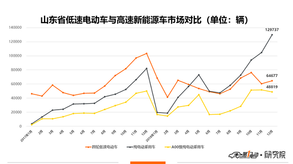 与高速纯电动车销量走势对比来看,四轮低速电动车在今年4月结束了与高速电动车一致的冲高走势。在高速电动车5月面临补贴过渡期最后一个整月,集体抢装冲量时,山东省低速电动车产量反而开始一路下滑。8月后,高速纯电动车一路上扬,表现亮眼;而低速电动车,虽然也在8月出现转机掉头上扬,然而最后两月,又再次变换了航线。巧合的是,A00级纯电动车也在这两月市场表现欠佳,同样出现回落。